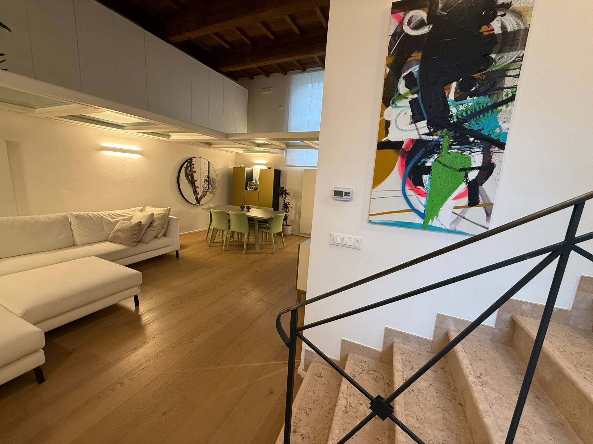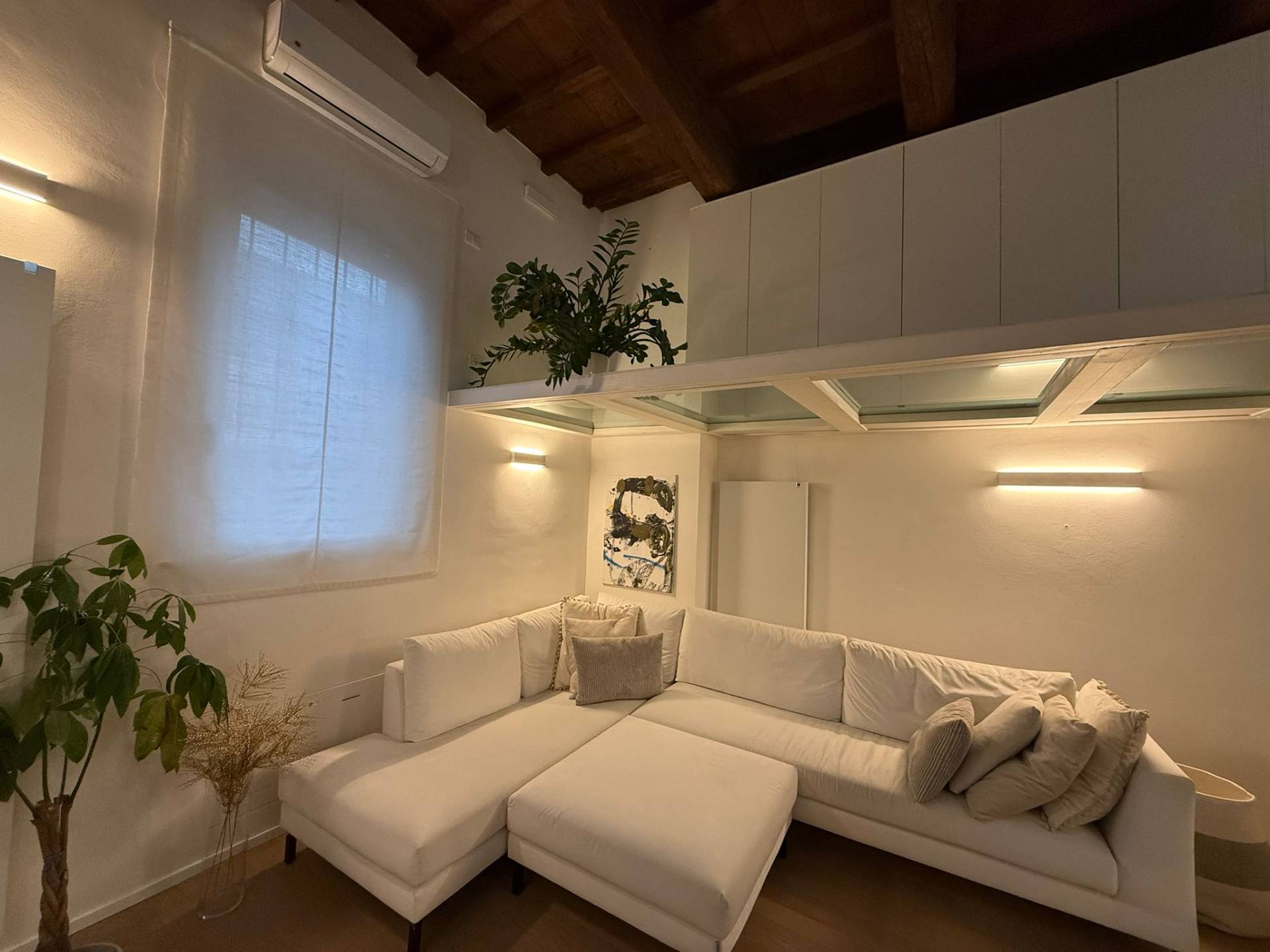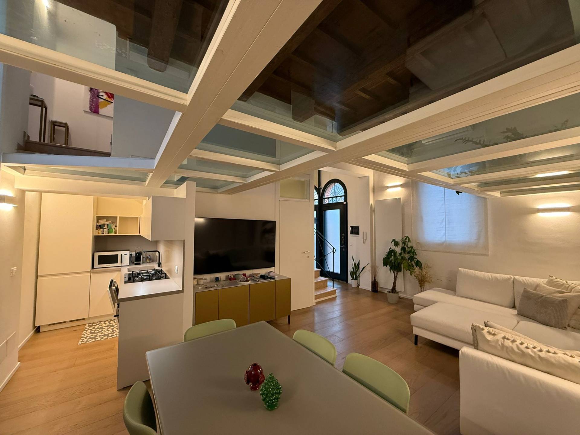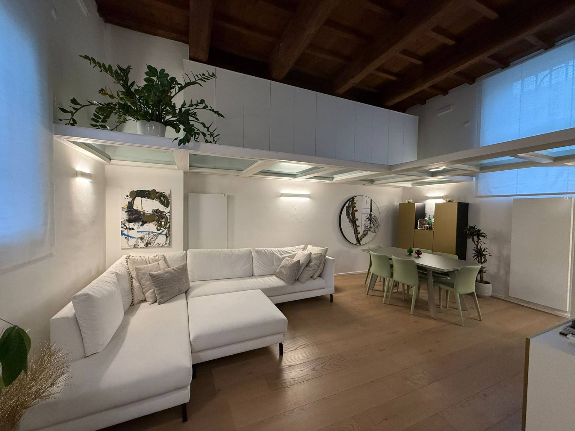 Immobile ristrutturato a nuovo. Ingresso su luminosa zona living open space, angolo pranzo, cucina a vista, bagno con box doccia rivestito completamente in resina, soppalco in vetro ideale come zona armadiatura o studio, soffitti a cassettoni di 5 mq. di altezza. Al livello ammezzato si accede a soppalco abitabile. Piano superiore con camera da letto matrimoniale, camera da letto doppia, ripostiglio con lavatrice e asciugatrice, secondo ampio bagno finestrato totalmente rivestito in resina con box doccia. Travi a vista, velux elettrico. Infissi in legno con gas coibentanti. Cappotto interno con nanotecnologia. Scarpiera a scomparsa. Ripostiglio in sottoscala. Radiatori a piastra piatta. Aria condizionata/pompa di calore. Utenze centralizzate con contacalorie. Giardino esclusivo e posto auto coperto da tettoia. Garage doppio (parcheggiabili due macchine). Si vende parzialmente arredato. Posto bici. Finiture di pregio. Libero. Info presso i ns. uffici.