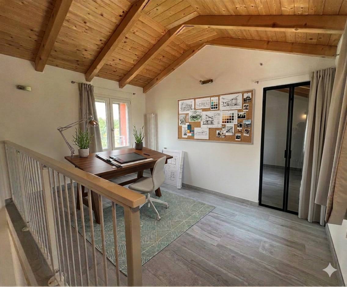 L'immobile di sviluppa su due livelli, al piano terra e al primo piano: ingresso su zona soggiorno e pranzo, cucina abitabile, bagno finestrato, ripostiglio; al primo piano due camere da letto (matrimoniale e doppia), secondo bagno, disimpegno uso studio. Dal soggiorno e dalla cucina si accede al patio e alla corte verde piantumata che godono della massima privacy.